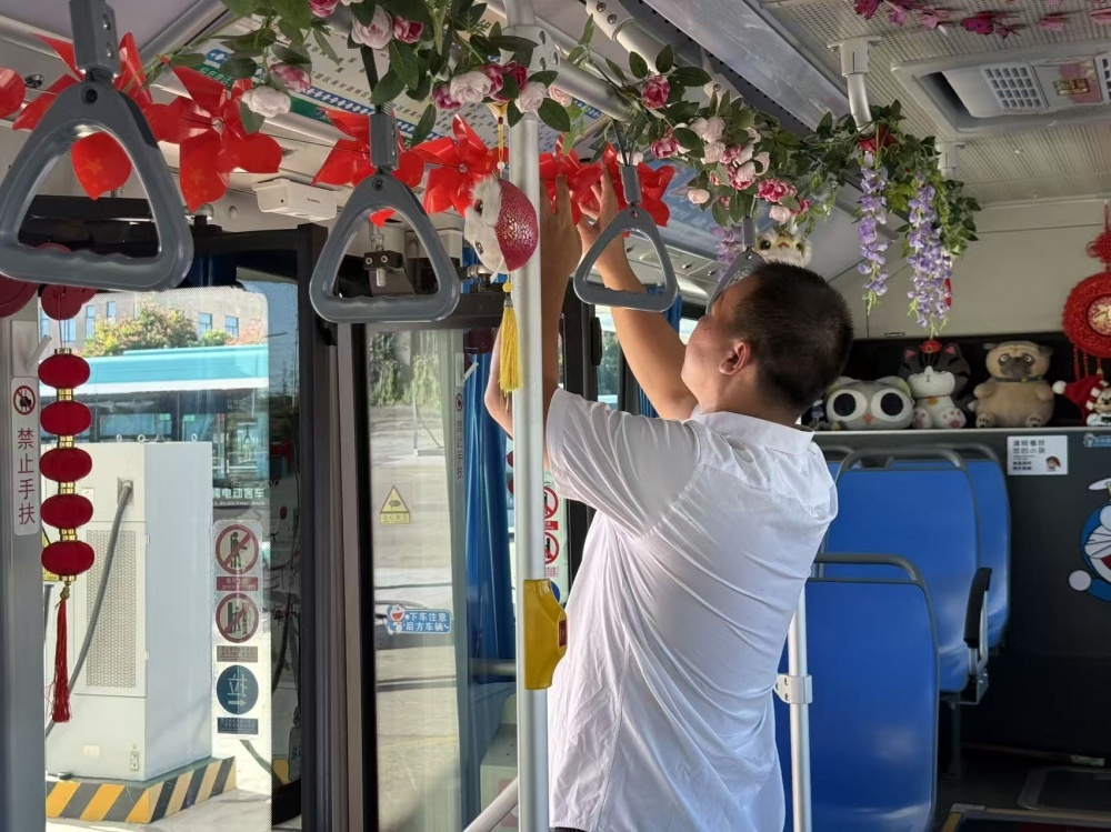 張峻峰是荊門公交2024年度“最美公交人”,他的車上總比別人多點“暖心”東西:駕駛座旁的小盒子里備著暈車藥、創(chuàng)可貼和折疊傘?!敖衲陣鴳c,就想乘客上車能樂呵樂呵?!庇谑菑埦寰蛣恿搜b飾車廂的念頭。他自費買了小國旗、風(fēng)車、燈籠等裝飾,晚上在家剪剪貼貼,白天利用休息時間在車上裝飾。張峻峰的行動,也是荊門公交服務(wù)提升的一個縮影。